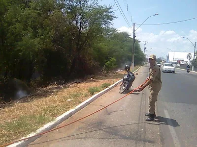 A polícia ambiental esteve no local enquanto os Bombeiros realizavam os trabalhos para conter as chamas que atingiam a cerca de marcação do terreno para evitar que as chamas chegassem até as residências próximas.