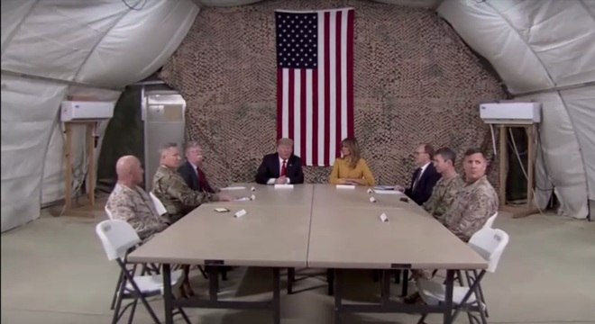 Ao lado da primeira dama Melania Trump, o presidente americano fez uma visita surpresa no Natal de 2018, onde participou de um jantar com os militares baseados nas instalações militares.