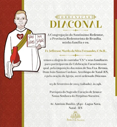 fevereiro de 2024, às 19h, o Fr. Murilo será ordenado Diácono pela imposição das mãos e Oração Consecratória de Dom João Cardoso, Arcebispo de Natal-RN, para o serviço da Igreja e do Povo de Deus.