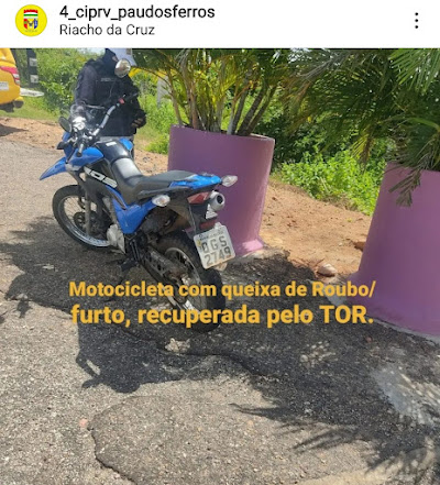 Hoje, 10 de Maio de 2022, por volta das 11h00min, a guarnição do TOR, em patrulhamento tático e abordagem na RN 076 em Riacho da Cruz/RN, conseguiu identificar e RECUPERAR mais um veículo com Queixa de ROUBO/FURTO. Tratar-se da Moto Honda Bros NXR 160 de Placa QGS2749 de Cor Azul. O veículo e o proprietário foram apresentados na Delegacia de Polícia Civil de Portalegre, RN para procedimentos cabíveis.